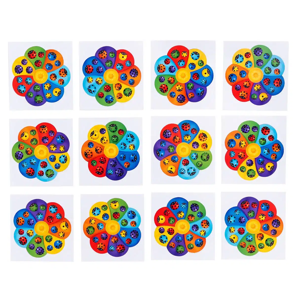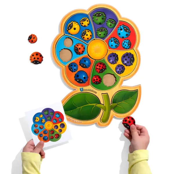Jasný kvet, kde farby ožívajú! Dieťa umiestňuje lienky na okvetné lístky, pričom plní úlohy na kartách alebo si vymýšľa vlastné pravidlá. Okvetné lístky a kruhy sú zameniteľné, čo umožňuje nekonečne variovať hru. Ideálne na oboznamovanie sa s farbami, veľkosťami a rozvíjanie logiky.