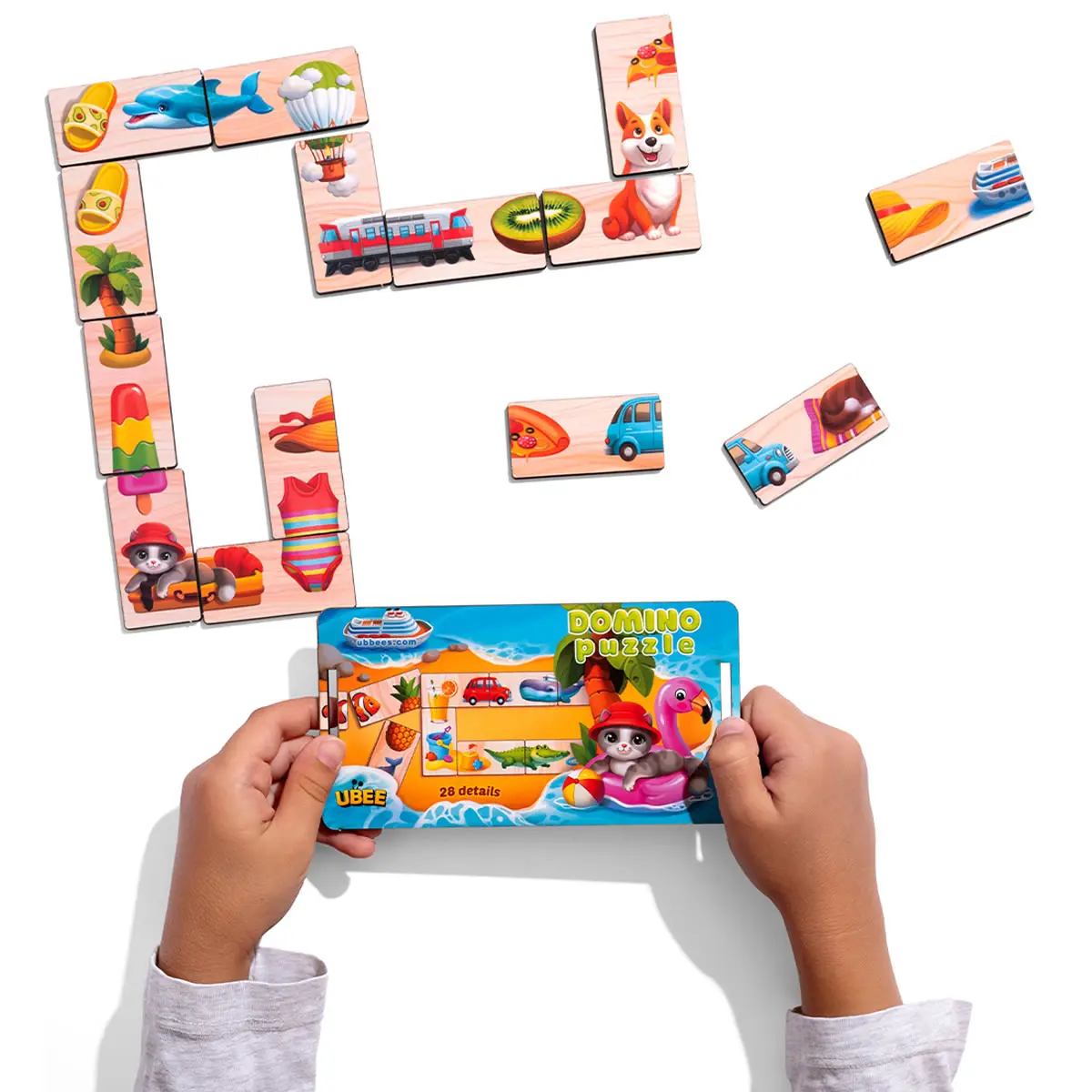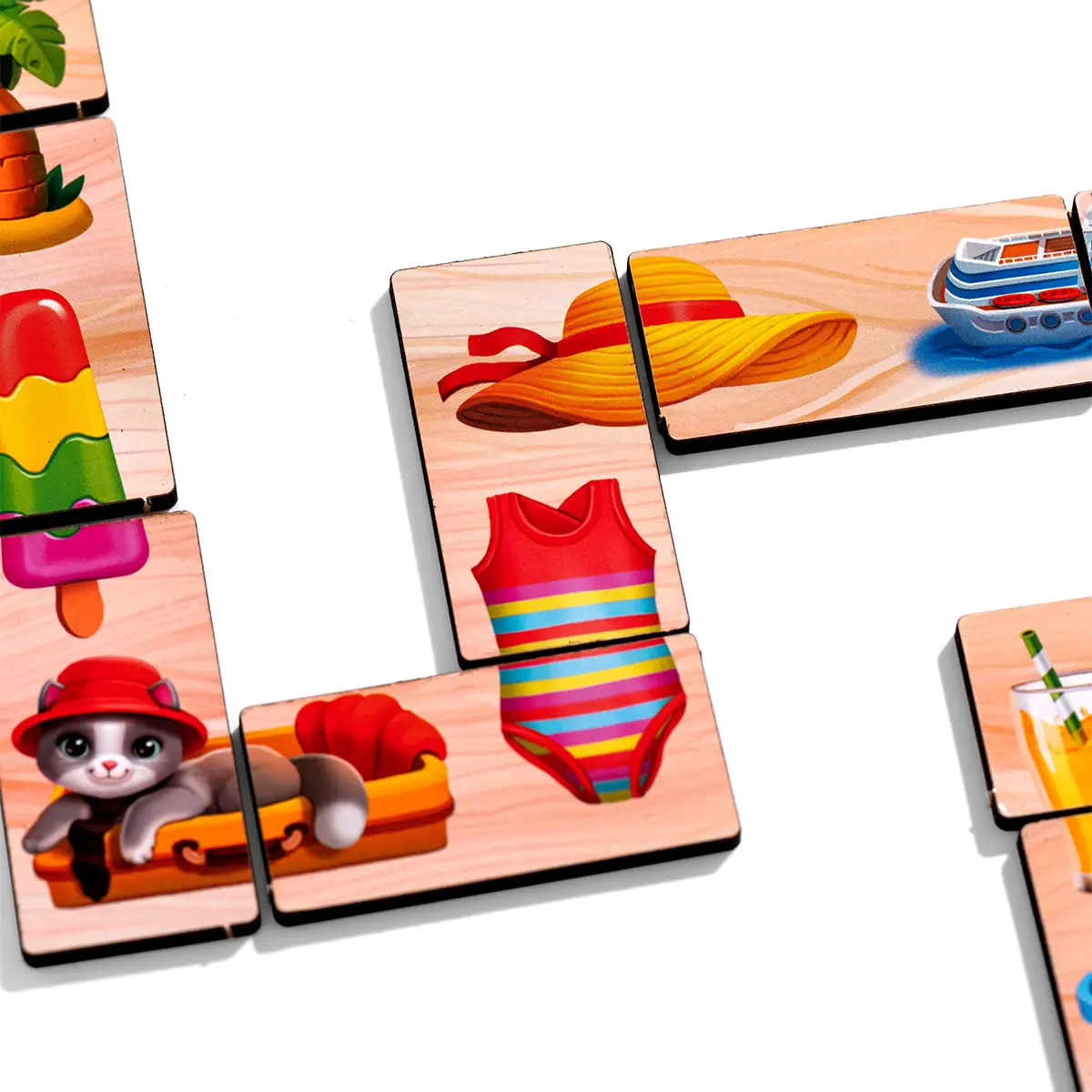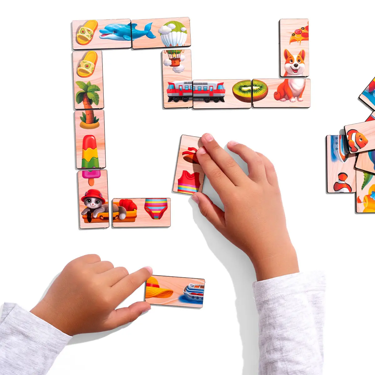 Predstavte si dieťa, ako majster puzzle, ktoré skladá obrázok z dvoch častí: loď s kapitánom, autobus s pasažiermi, zmrzlinu s malým maškrtníkom. Každá dvojica je nový letný príbeh, ktorý ožíva priamo v dlaniach dieťaťa. Hra trénuje vizuálne vnímanie a logiku a zároveň dáva radosť z objavovania.