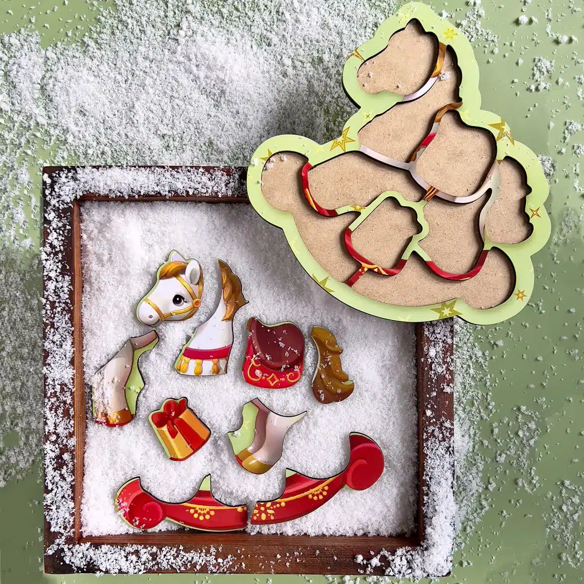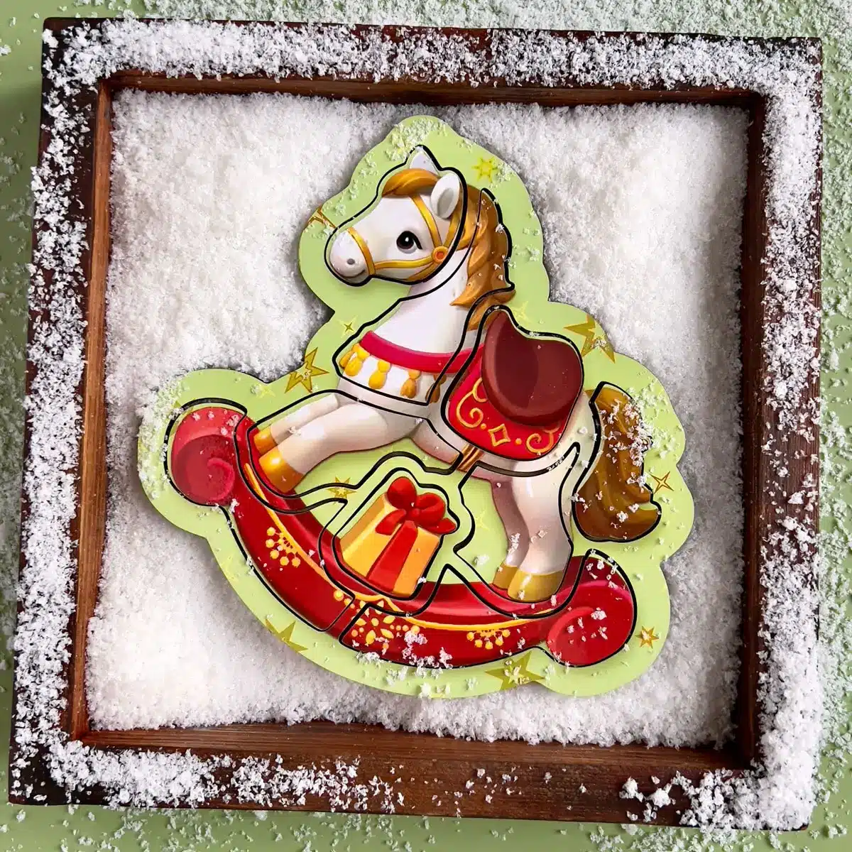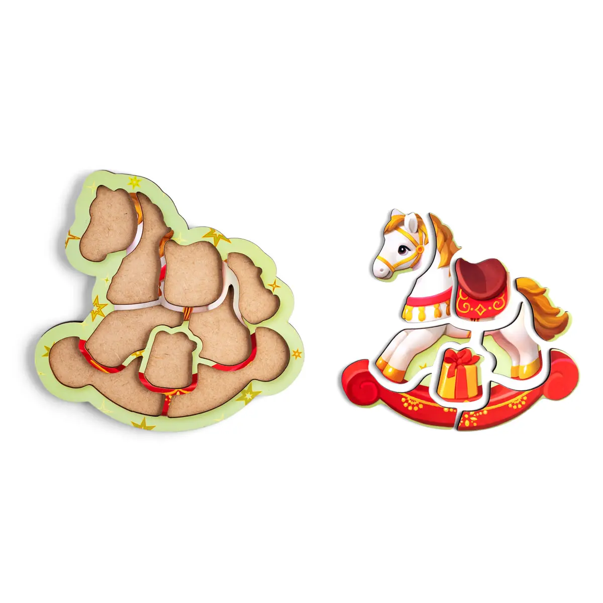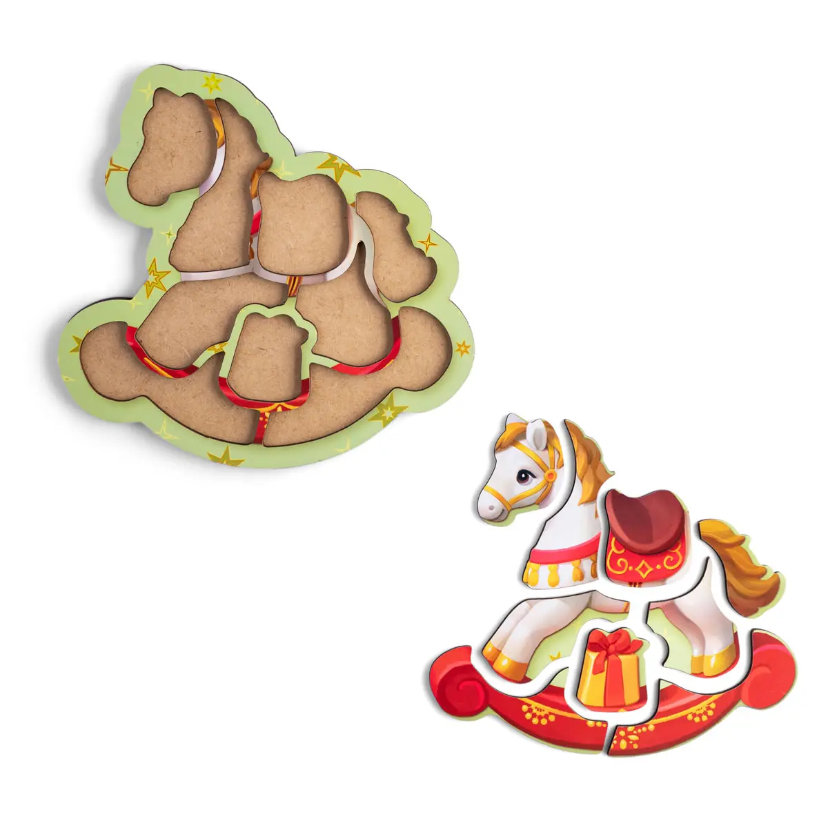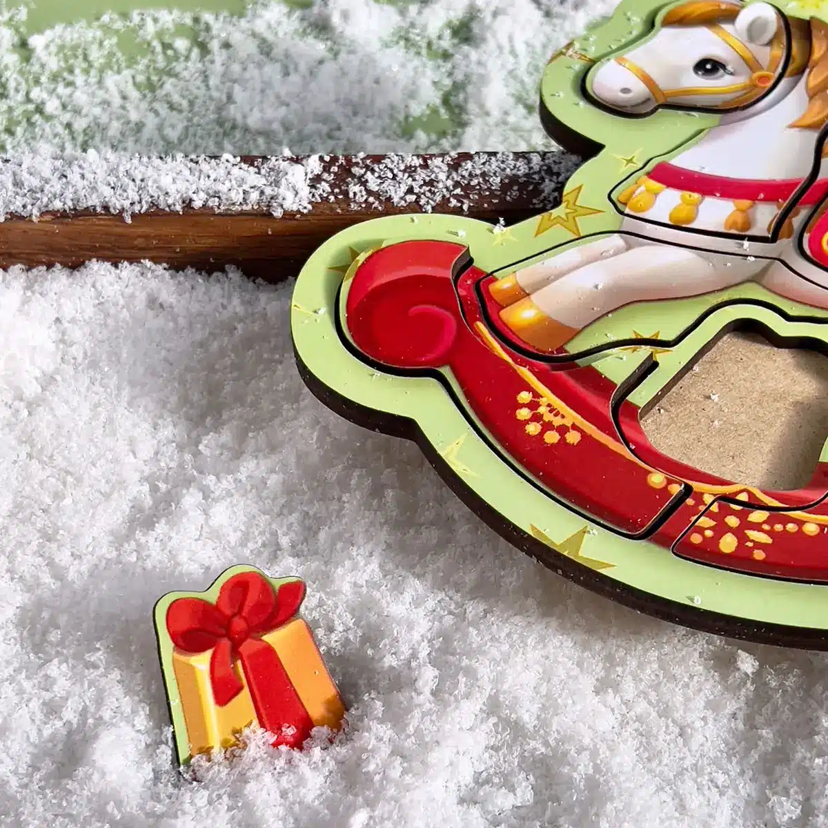 Pred dieťaťom je žiarivý hojdací kôň s darčekom pod sedlom. Obľúbený detský obrázok ožíva v podobe prvého puzzle. Dieťa vyberá detaily, študuje kontúry, farby a potom samostatne poskladá figúrku späť. Rám vám povie, ako to urobiť správne – dieťa sa učí konať opatrne a dôsledne.