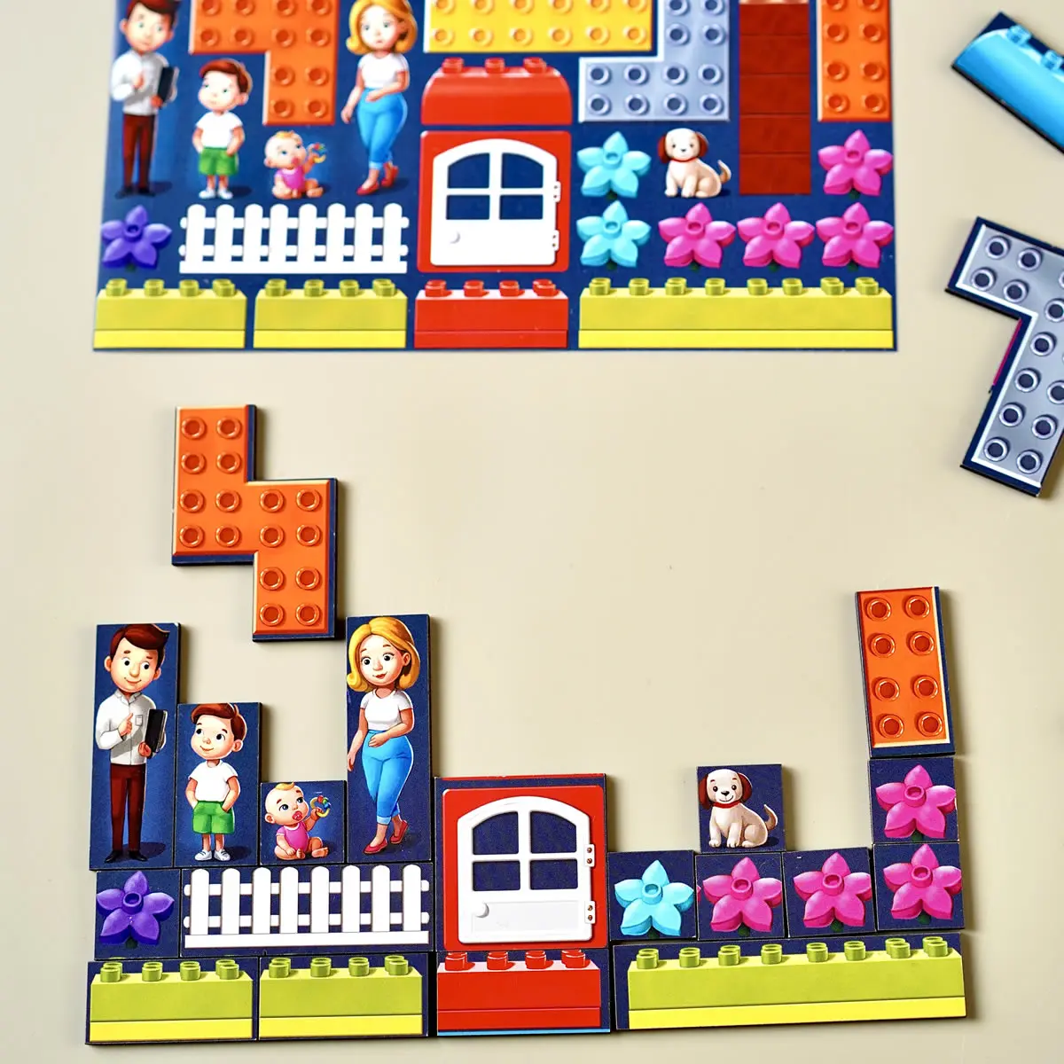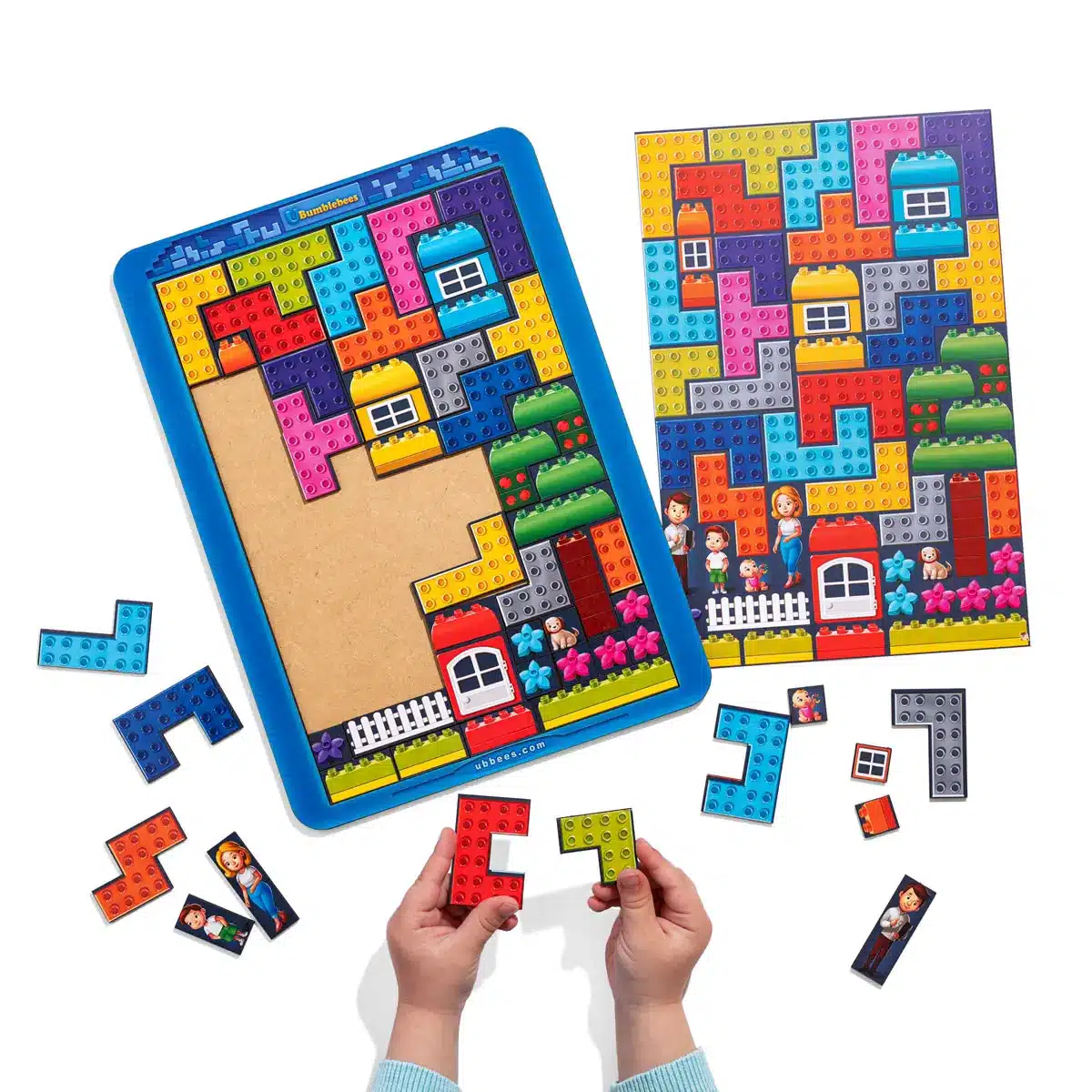 Toto nie je len Tetris – je to príbehová hra s priestorovým myslením. Dieťa si postaví dom z figúrok rôznych tvarov a farieb, vyberie detaily tak, aby sa zmestili do rámu bez medzier. A tiež – dokončí plot, okná, stromy a obyvateľov. Hra kombinuje logiku, predstavivosť a prvé zručnosti architekta.