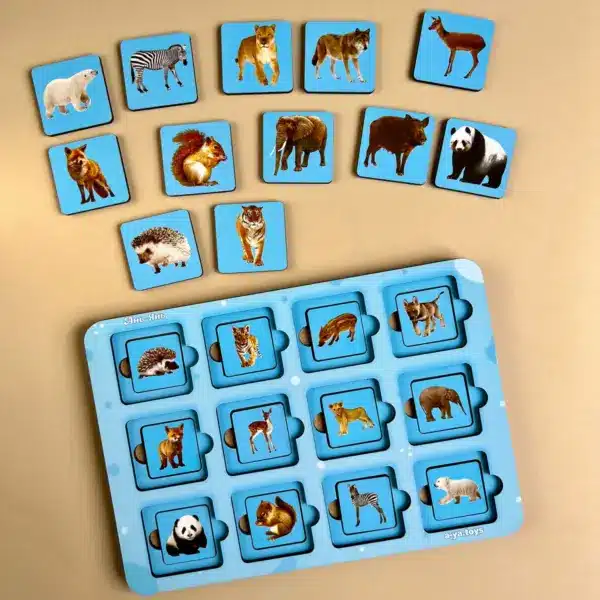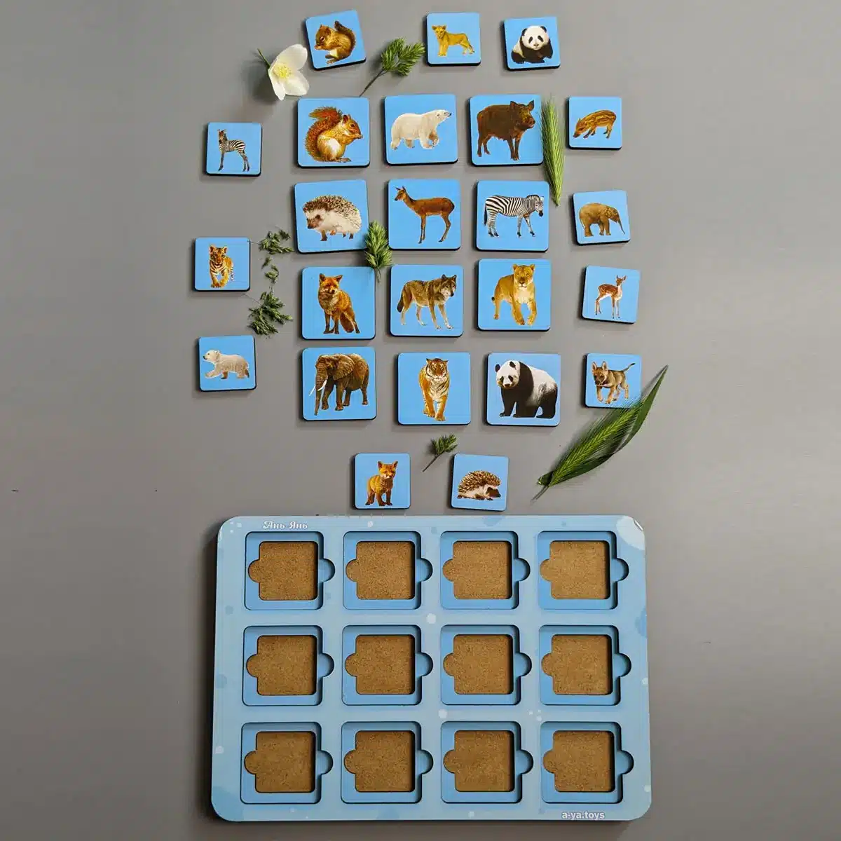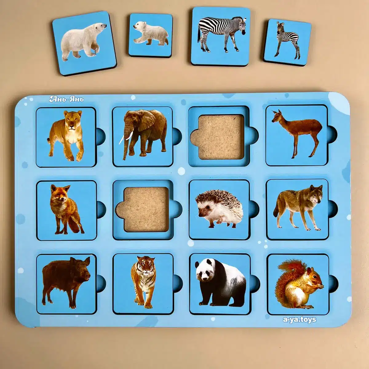 🐾 Pred dieťaťom je pár: matka a mláďa. Známe divoké zvieratá v realistických obrázkoch pomáhajú pochopiť, ako vyzerajú dospelé jedince a mláďatá, kto komu patrí. Dieťa vidí zebru a malé pruhované žriebä, líšku a líščie mláďa, veveričku a veveričku – a učí sa pozorovať, porovnávať a zoskupovať.