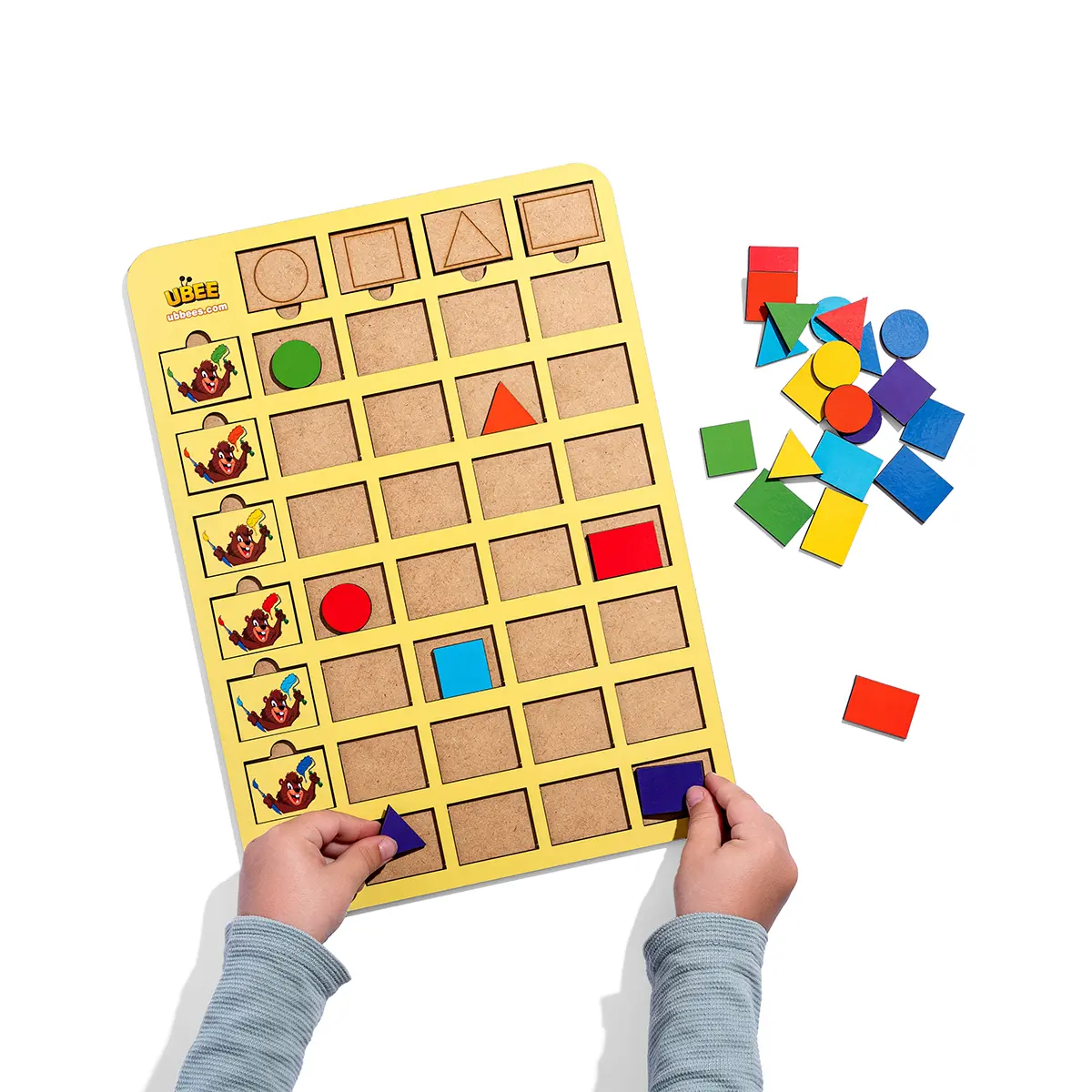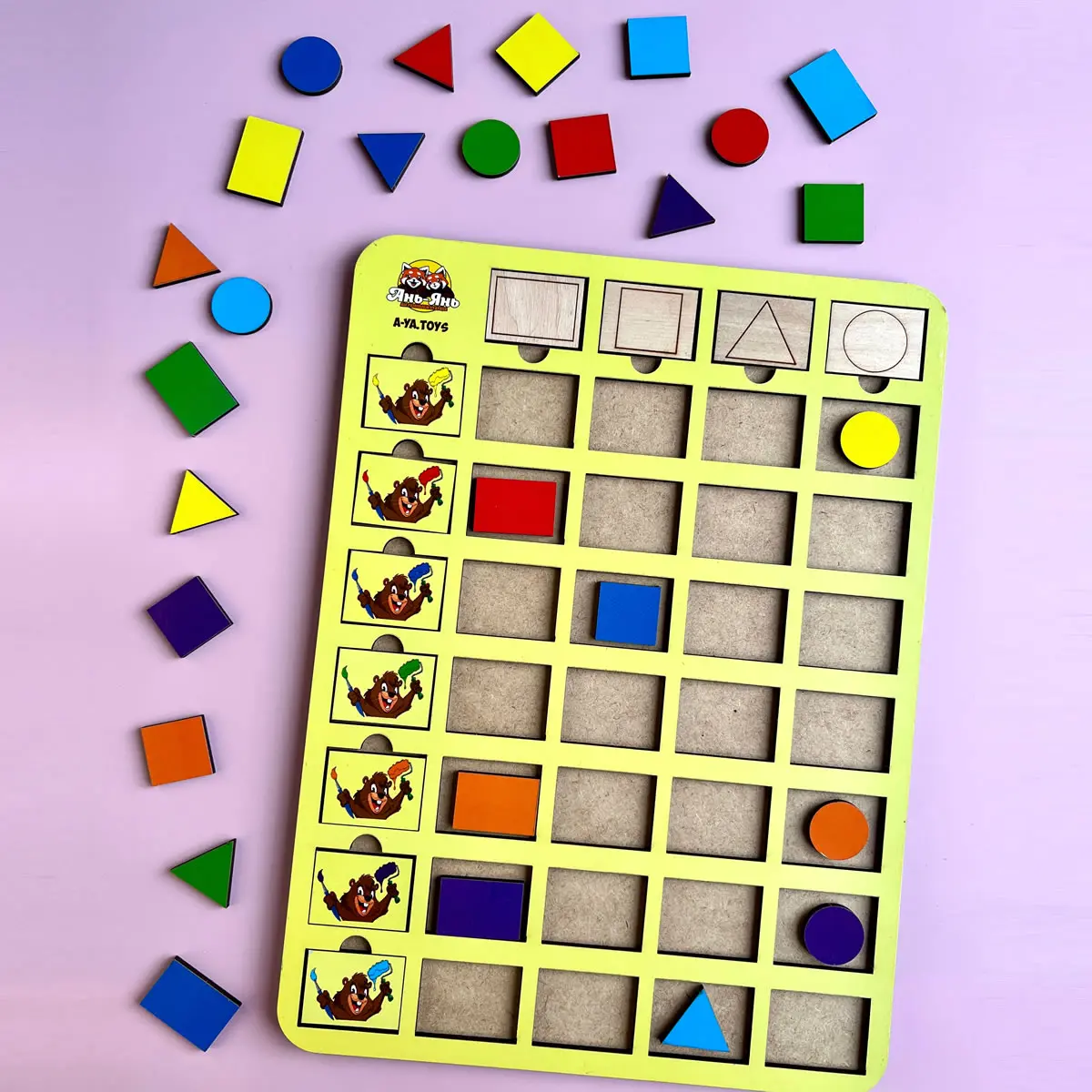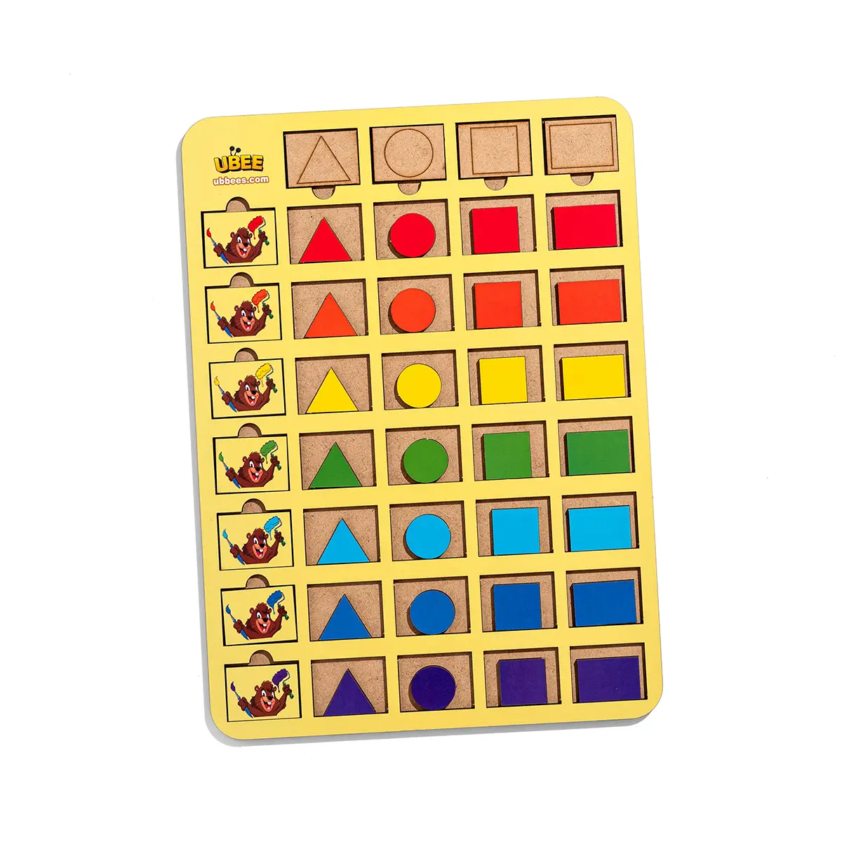 Dospelý alebo dieťa zadá úlohu: farbu v ľavom stĺpci a tvar v hornom riadku. Dieťa musí nájsť a vložiť správnu časť, ktorá zodpovedá farbe aj tvaru. Vďaka zameniteľnosti prvkov sú možné rôzne herné možnosti: učenie sa podľa úlohy, hra „nájdi dvojicu“ alebo vytváranie vlastných kombinácií.