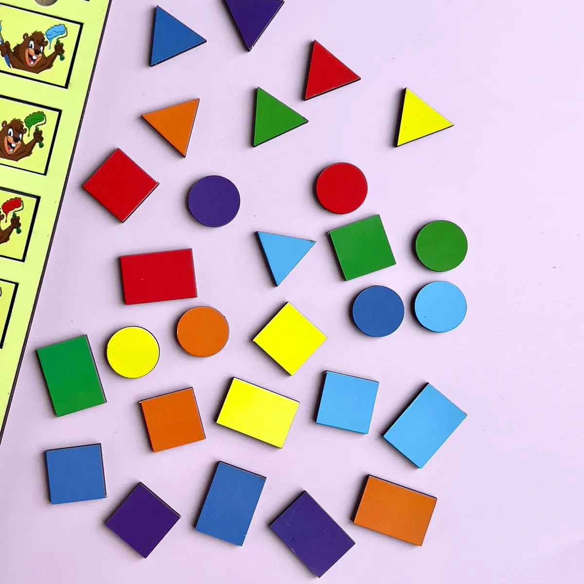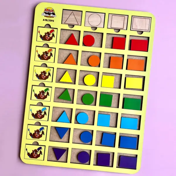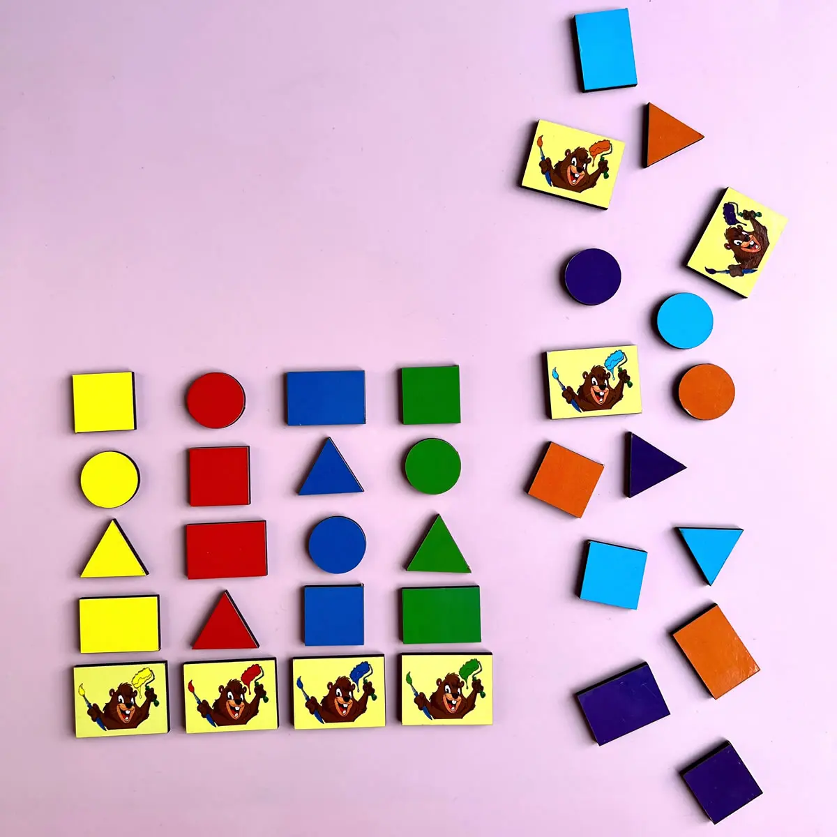 Dospelý alebo dieťa zadá úlohu: farbu v ľavom stĺpci a tvar v hornom riadku. Dieťa musí nájsť a vložiť správnu časť, ktorá zodpovedá farbe aj tvaru. Vďaka zameniteľnosti prvkov sú možné rôzne herné možnosti: učenie sa podľa úlohy, hra „nájdi dvojicu“ alebo vytváranie vlastných kombinácií.