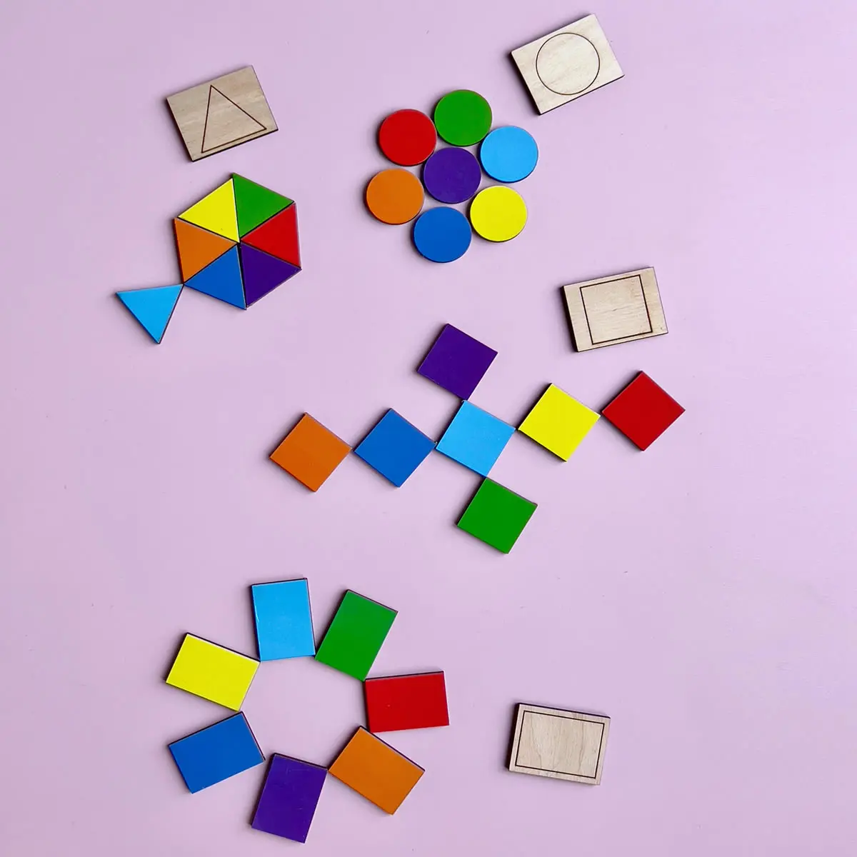 Veľká drevená doska s mriežkou a sadou farebných tvarov rôznych tvarov: trojuholníky, štvorce, obdĺžniky a kruhy.