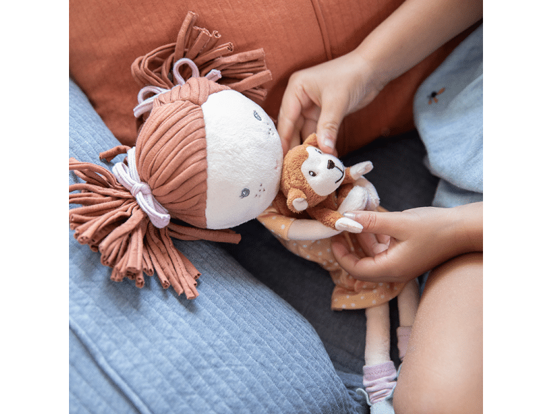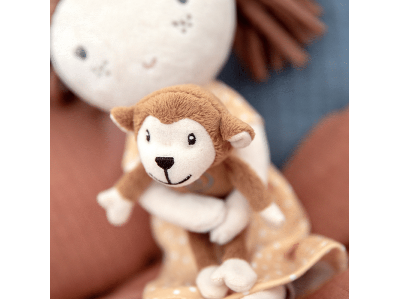 Nežná plyšová bábika Sofia z mäkkého jemného materiálu je ideálna ako prvá bábika pre vaše dieťa. Bábika drží v ruke malú plyšovú opičku, pripevnenú suchým zipsom. Bábika je vhodná na hranie aj maznanie .