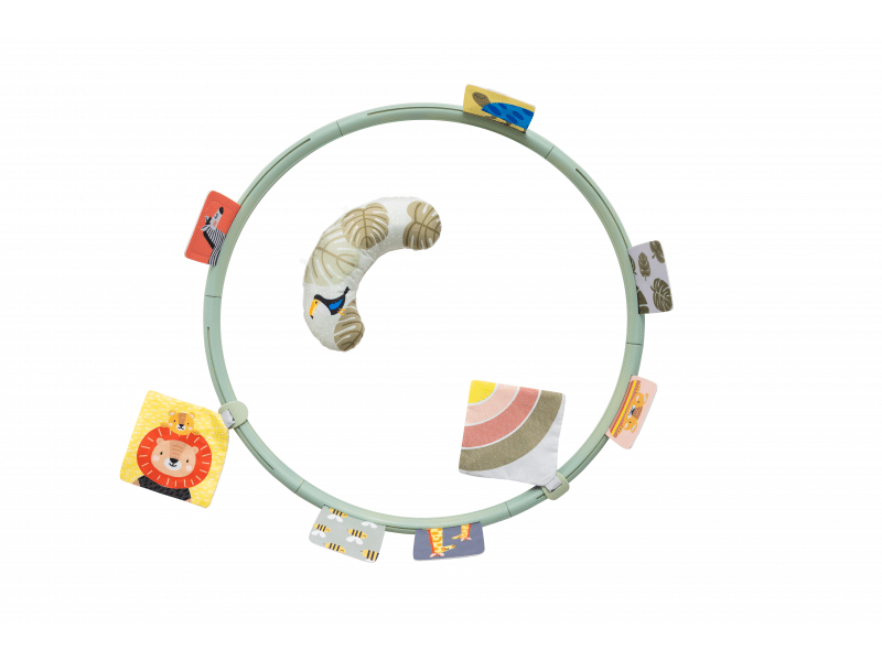 Modulárny dizajn: Kruh sa skladá z niekoľkých dielov, ktoré sa jednoducho spájajú. Do otvorov v kruhu môžete pripevniť rôzne aktivity podľa aktuálnych potrieb dieťaťa.