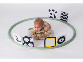 Od 3 mesiacov: Pre deti od 3 mesiacov sú k dispozícii obrázky v jasných farbách a dva textilné šuštiace štvorce s rôznymi obrázkami a textúrami na skúmanie.