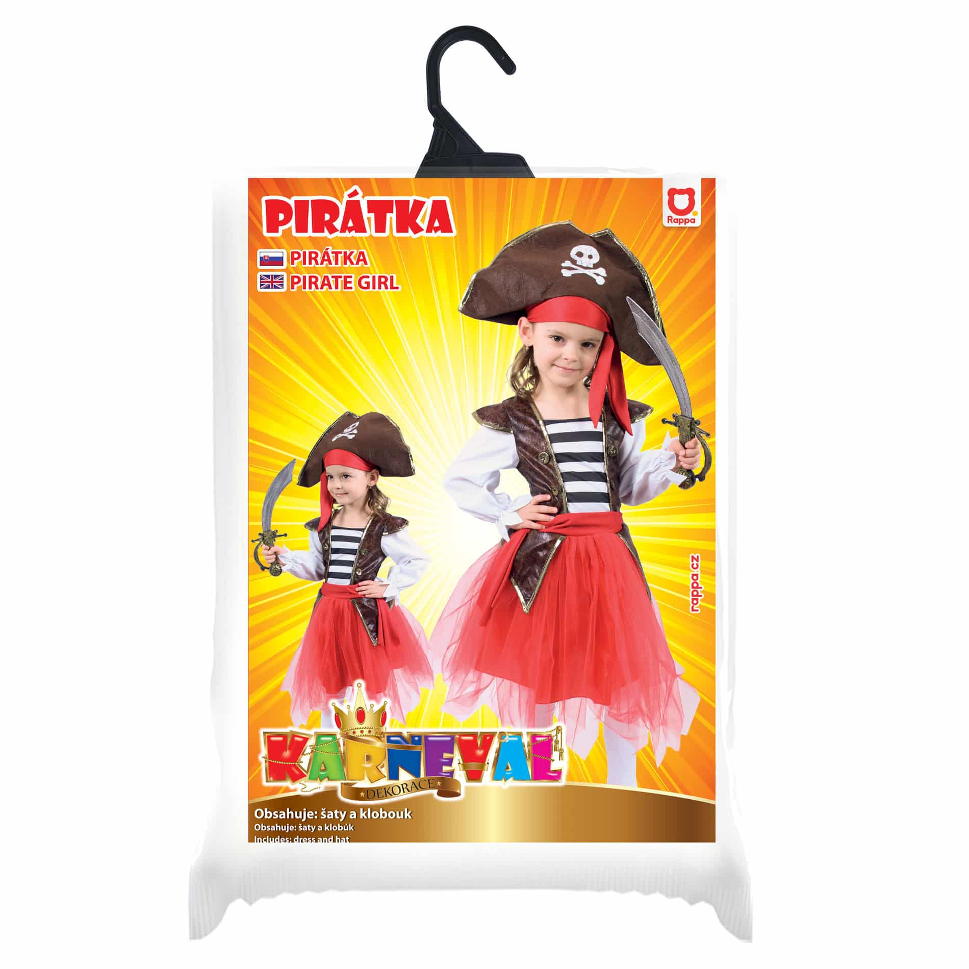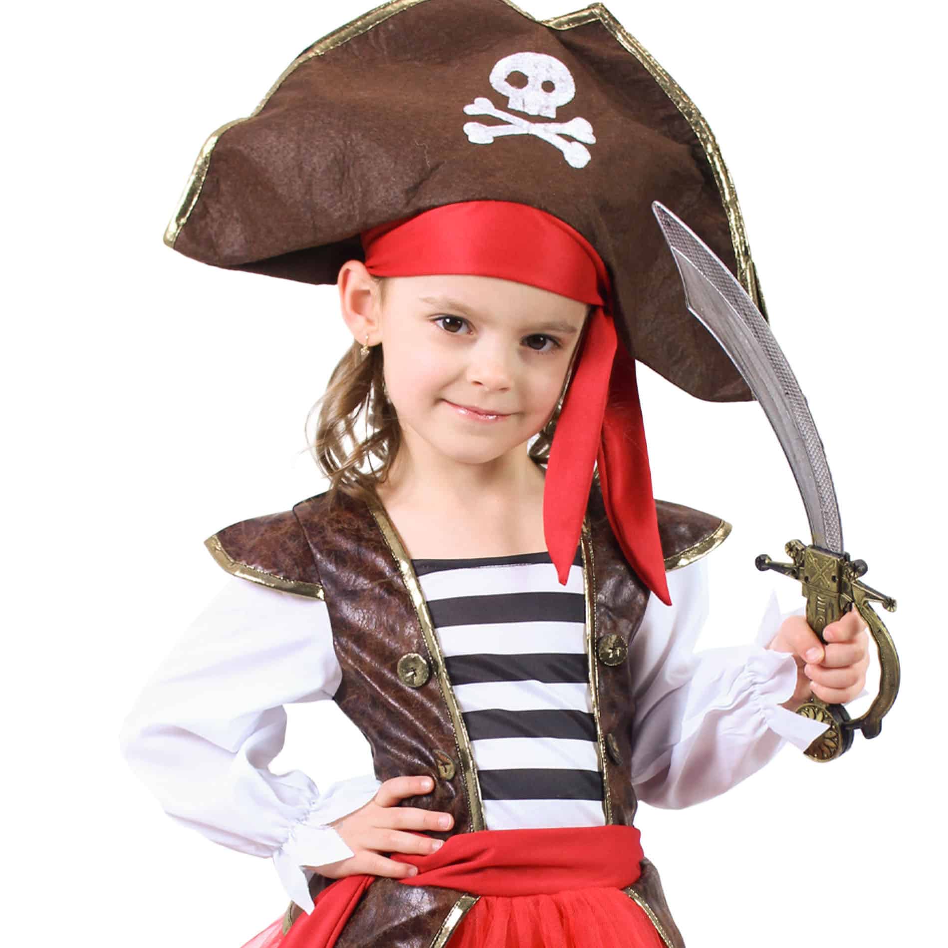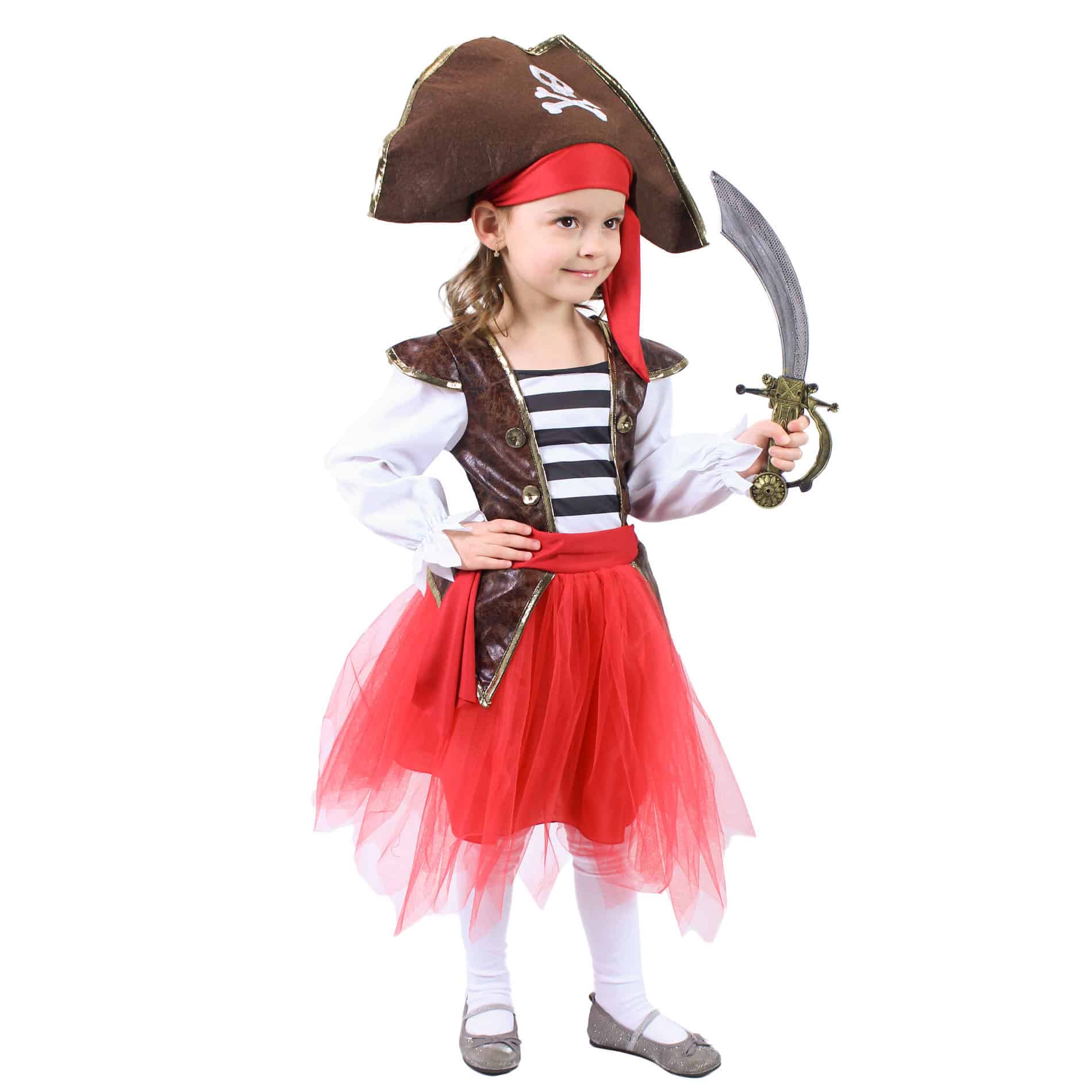 Staň sa pirátkou, ktorá má štýl! Tento krásny kostým s tylovou červenou sukňou je ozdobený všitou vestou v imitácii kože. Aby bol kostým kompletný, obsahuje typickú pirátsku čiapku s potlačou lepky. Tento kostým vo veľkosti M je vhodný pre dievčatá vo vekovom rozmedzí 6-8 rokov (117-128 cm).