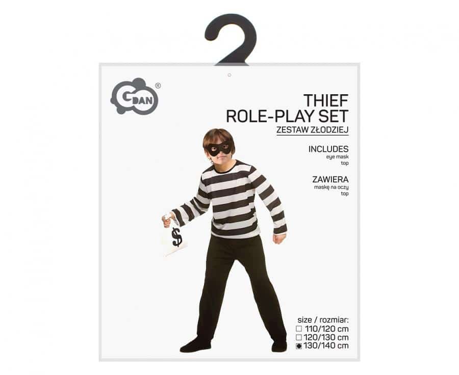 Detská kostým Zlodej obsahuje masku na oči a top, vďaka čomu dieťa rýchlo získa charakteristický „záhadný“ vzhľad. Skvelé na karneval, tematické párty, školské vystúpenia aj domáce hry na postavy. Podporuje fantáziu, tvorbu príbehov a spoločnú hru. Veľkosť 130/140 cm je vhodná pre deti približne v danom rozsahu výšky.